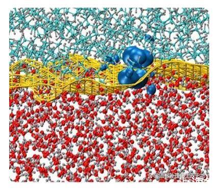 大多數(shù)DFT模擬的計(jì)算要求通常與電子數(shù)的立方成比例。但對于具有大帶隙特性的絕緣系統(tǒng),僅線性擴(kuò)展的DFT技術(shù)可用于研究電子結(jié)構(gòu)。利用這種方法,哈桑納利和他的同事在納米尺度上模擬了由數(shù)千個(gè)原子組成的疏水界面的電子效應(yīng)。下圖顯示了模擬的油水界面。