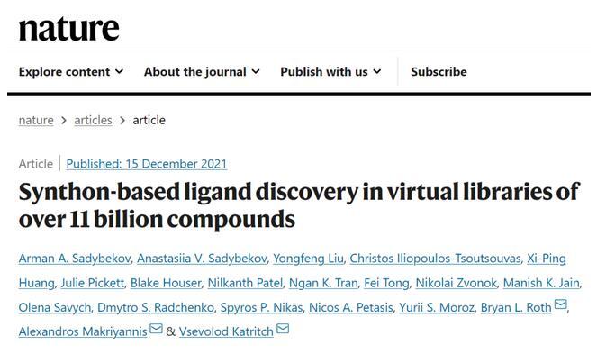 2021年12月15日,美國南加州大學、東北大學和北卡羅來納大學教堂山分校的研究團隊合作,在Nature發(fā)表了題為:Synthon-based ligand discovery in virtual libraries of over 11 billion compounds的研究論文。