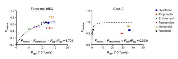 隨后,研究分析了各種腸道轉(zhuǎn)運(yùn)體和代謝酶的表達(dá)水平,通過(guò)RNA測(cè)序與酶活性檢測(cè),發(fā)現(xiàn)腸道堿性磷酸酶(IAP)和CYP3A4在功能性hIEC中表達(dá)量相當(dāng)高,這些結(jié)果表明功能性hIEC具有藥物轉(zhuǎn)運(yùn)體和藥物代謝酶活性,是評(píng)價(jià)藥物體外生物利用度所必需的。本研究使用了6種臨床藥物:美托洛爾、普萘洛爾、雙氯芬酸、雷尼替丁、呋塞米和紅霉素,進(jìn)行體外藥物吸收試驗(yàn),發(fā)現(xiàn)與Caco-2模型不理想的體內(nèi)外相關(guān)性相比,功能性hIEC與已公布的人體內(nèi)腸道吸收數(shù)據(jù)擬合的相關(guān)性良好,說(shuō)明功能性hIEC可以更好地預(yù)測(cè)人的口服生物利用度和吸收程度。