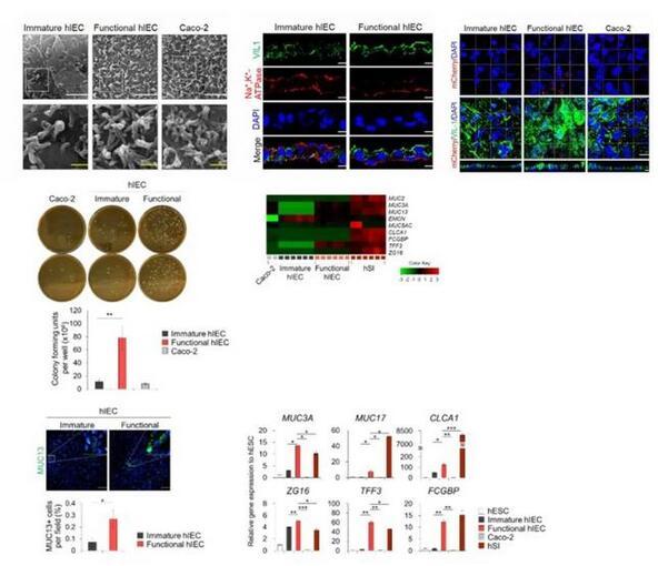 由于在hSI中,Wnt的抑制和Notch的激活有助于祖細(xì)胞分化為吸收前上皮細(xì)胞,研究者使用了Wnt信號(hào)抑制劑Wnt-c59和Notch信號(hào)激動(dòng)劑丙戊酸(VPA),來(lái)進(jìn)一步將hIEC祖細(xì)胞分化為與體內(nèi)類似的成熟且有功能的hIEC。與其他僅由吸收性腸細(xì)胞組成的小腸上皮模型相比,該系統(tǒng)可以模擬體內(nèi)樣腸組織進(jìn)行研究。與未成熟的hIECs相比,功能性hIECs形成了一個(gè)結(jié)構(gòu)極化的單層,并觀察到了類似杯狀細(xì)胞分泌出的粘液。此外,功能性單分子層hIEC的頂表面接觸的細(xì)菌數(shù)量明顯更高,并且黏液蛋白和黏液蛋白相關(guān)基因的表達(dá)在功能性hIEC中顯著增加能夠允許腸道微生物群的持續(xù)定植。
