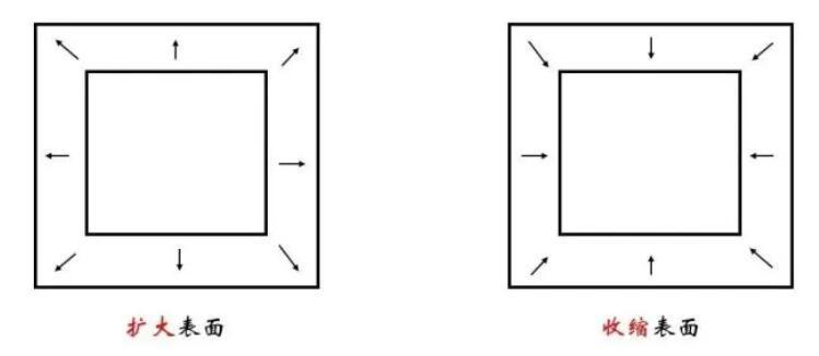 那么表面張力的方向是什么呢?我們同樣類比重力、彈力等力。簡單回顧不難發現,如果將表面張力理解為單位面積形變引起的能量升高,那么對應的力應該指向使得能量降低的方向。對于表面張力,自然就是沿切線使得表面收縮的方向。