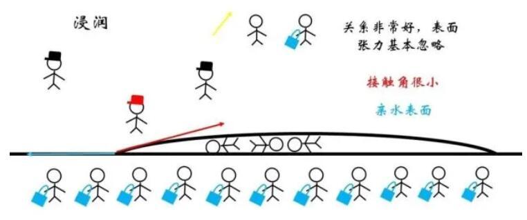 對于浸潤的情況,液體與固體物質間的關系很好,最為極端地可以認為該界面處的表面張力小到可以忽略。這樣一來,需要紅色和藍色的力的水平分量達到平衡,液滴的形狀趨于扁平。一般將氣液界面處張力與液固界面的夾角稱為接觸角,對于浸潤現象顯著的親水表面接觸角很小。