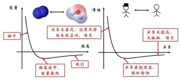 在微觀世界存在著多種多樣的分子,比如上圖所示的氮氣與水分子。分子間組成的體系的勢能與分子間的距離有關。這種關系正如兩個人之間的關系,遠了近了都不好。如果距離太近,彼此之間沒了自我空間,情緒會不穩定,因此會產生相互排斥的作用;如果距離太遠,每個人都太孤獨,便會相互思念,彼此吸引。當彼此的距離恰到好處,便對應著能量的最低點,較為穩定。