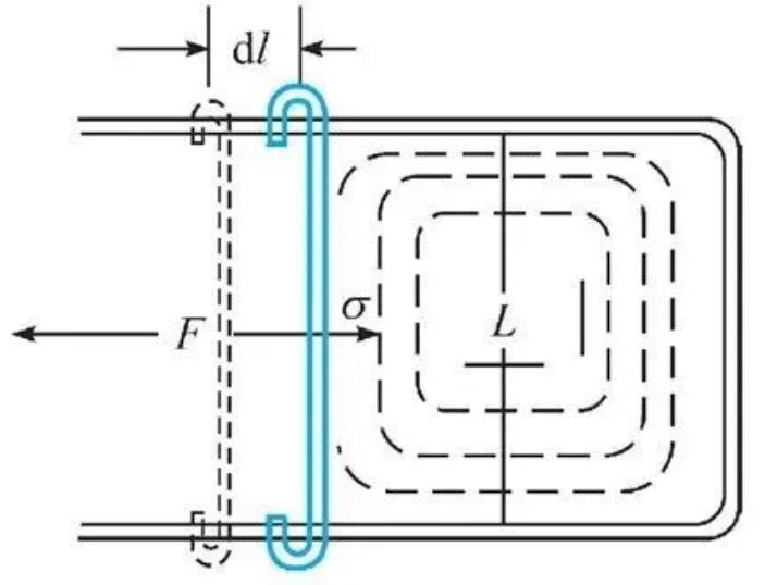 我們曾經提到比表面能的單位是J/m,而將這個物理量從力的角度去理解對于處理一些問題更加直觀,我們常常將比表面能稱為表面張力。而J/m=N/m,并不是力的單位N,因此表面張力代表的是作用在單位長度的表面上的力。在下圖所示的實驗中,肥皂水膜在力F的牽拉下長大,表面張力便是