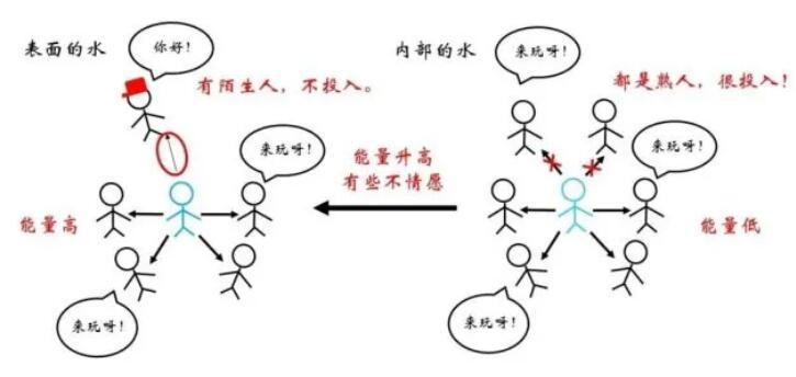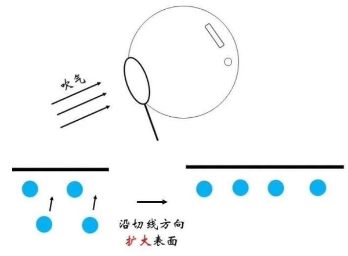 俗話說“物以類聚,人以群分”,更加相似的同類分子間往往關系更為融洽,而不同種分子間的關系則相對疏遠。在物理上表現為同類分子間的勢能曲線最低點更低。因此,對于一個存在于內部的水分子,如果來到表面,需要斷開與同類分子的部分關系,而代之以與比較“生疏”的空氣分子間的作用,顯然是不情愿的!這體現為能量的升高。那么,什么情況下水分子要從內部來到表面呢?正是吹泡泡的時候。