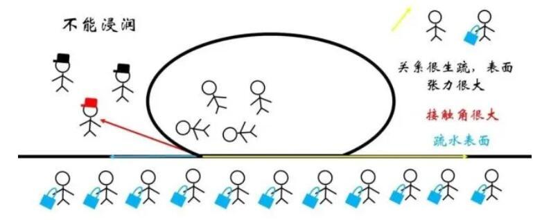 反之,對于疏水表面,固液界面處的表面張力可能非常大,以至于接觸角只有達到鈍角甚至趨近于180°才能達到平衡,此時的現象稱為非浸潤或者不能浸潤。而這種表面由于較高的疏水性被稱為超疏水表面。