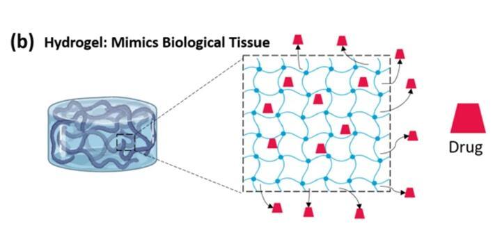 水凝膠是通過物理或化學(xué)交聯(lián)方法形成的三維聚合物網(wǎng)格。網(wǎng)格之間留有一定的空間,由于該網(wǎng)格的存在,水凝膠的結(jié)構(gòu)富含多孔性。聚合物網(wǎng)格可以截留大量的水,并防止其運輸?shù)酵獠凯h(huán)境,從而模仿生物組織的物理特性。這種保水能力,使水凝膠能夠提供良好的生物相容性和封裝藥物分子的平臺。該網(wǎng)格可以限制不同酶的滲透,從而保護包封的藥物免受各種酶降解。