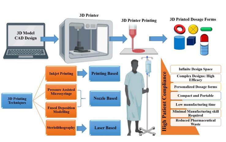 3D打印技術(shù)中不需要造粒、壓片以及包衣等環(huán)節(jié),并且可以靈活控制藥物的劑量以及釋放,所以該技術(shù)逐漸發(fā)展起來。3D打印技術(shù)主要有選擇性激光燒結(jié)(SLS)、光固化成型(SLA)、熔融沉積成型(FDM)、半固體擠出成型(SSE)以及噴墨成型打印(IJP)等方式。3D打印藥物目前的代表藥物,為FDA批準的Spritam。