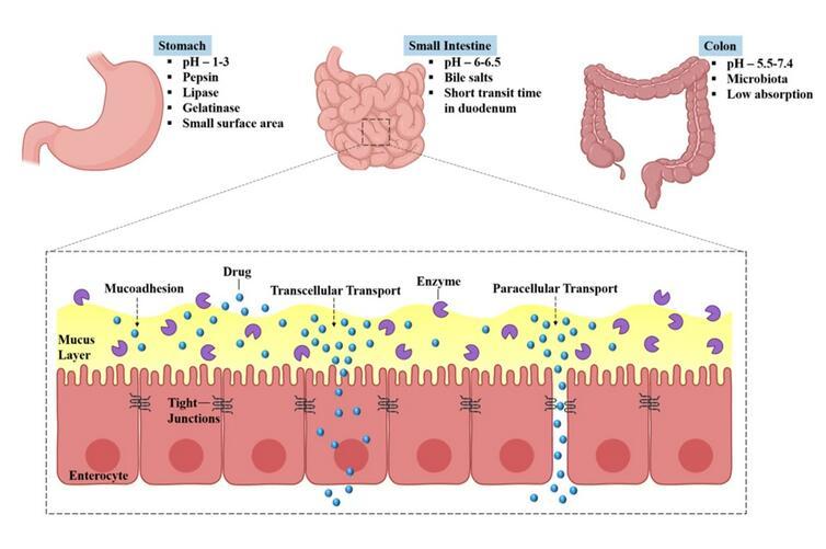 口服藥物在經(jīng)歷胃部的生理障礙后到達小腸。在小腸(十二指腸)的入口處,胰酶會引發(fā)幾種酶促轉(zhuǎn)化,這些酶還可能導(dǎo)致首過代謝,從而導(dǎo)致藥物生物利用度降低。因此,口服藥物必須克服這些生理學(xué)障礙。