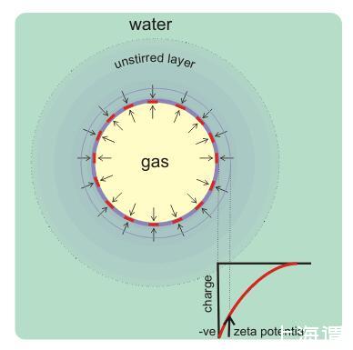 納米氣泡也存在比較強(qiáng)的靜電場(chǎng),能避免氣泡發(fā)生融合,對(duì)抗浮力作用。在水平電場(chǎng)中,氣泡電荷決定于水平速度v=ζε/μ(v=水平速度,ζ=zeta電位(V),ε=水的介電常數(shù)(s2×C2×kg-1×m-3),μ=粘滯度(Pa×s).)
