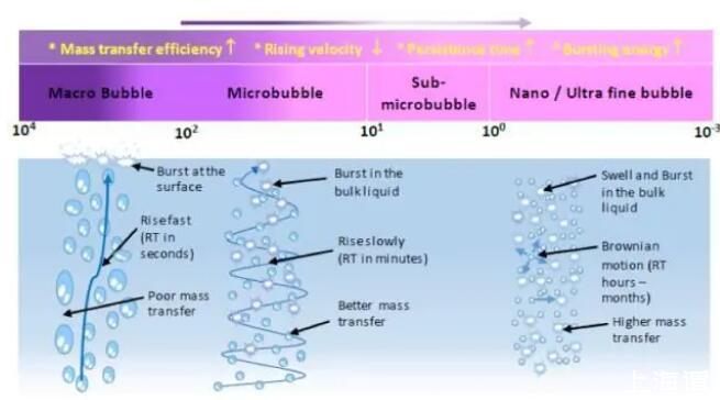 氣泡表面積和氣泡直徑呈負(fù)相關(guān)關(guān)系,(表面積A和直徑D的數(shù)學(xué)關(guān)系A(chǔ)=6/D)。因此同樣體積的氣泡,100納米直徑氣泡表面積是10微米直徑面積的100倍。