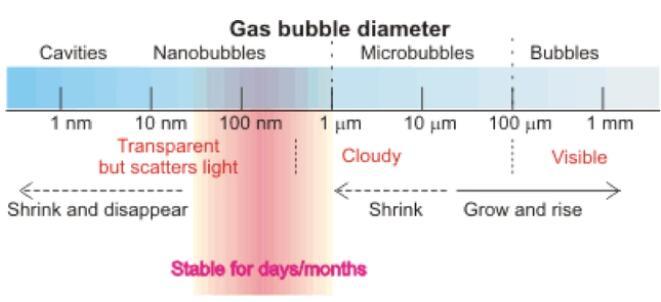 氣泡分類不僅根據(jù)大小,而且根據(jù)其特征和在液體中的行為。圖1對(duì)不同氣泡大小的分類進(jìn)行了匯總。1-10微米氣泡其大小和特征都介于微米氣泡和納米氣泡之間,被歸類到亞微米氣泡。雖然學(xué)術(shù)界對(duì)微米氣泡的特征有一致看法,但是對(duì)氣泡的大小范圍沒(méi)有統(tǒng)一標(biāo)準(zhǔn)。