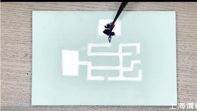 玄機(jī)主要在于后面滴加的染色液體上??梢钥闯?,這個(gè)液體加到迷宮起點(diǎn)之后是會(huì)自動(dòng)選擇“正確的道路”來(lái)前進(jìn)的。雖然液體加太多之后會(huì)溢出到其他死胡同的方向,但是液體前端剛剛到達(dá)分岔路的時(shí)候,可以明顯地看到一個(gè)選擇性拐彎的趨勢(shì),就像下面的動(dòng)圖這樣: