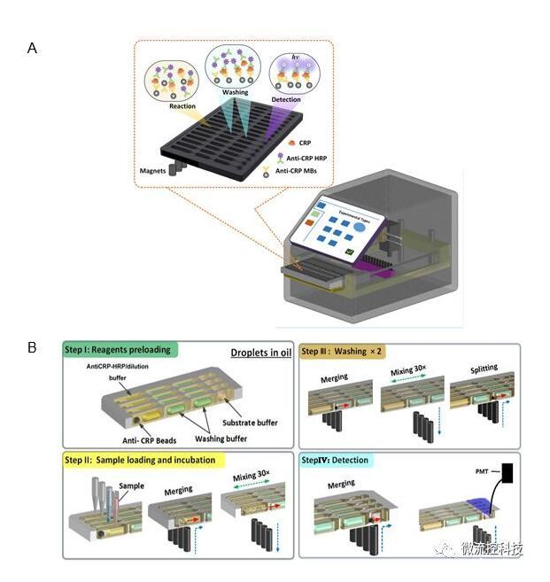圖2液滴陣列微流控芯片免疫分析系統。A.分析儀器結構示意圖;B.分析原理示意圖。
