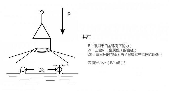 鉑金環是用直徑0.37mm的鉑金絲做成周長為60mm的環,測試時先將鉑金環浸入液面(或二種不相混合的界面)下2-3mm,然后再慢慢將鉑金環向上提,環與液面會形成一個膜。膜對鉑金環會有一個向下拉的力,測量整個鉑金環上提過程中膜對環的所作用的最大力值,再換算成真正的表面(界面)張力值。由于鉑金環法測試起來比較麻煩,測試誤差也比較大,已迅速被鉑金板法所取代。