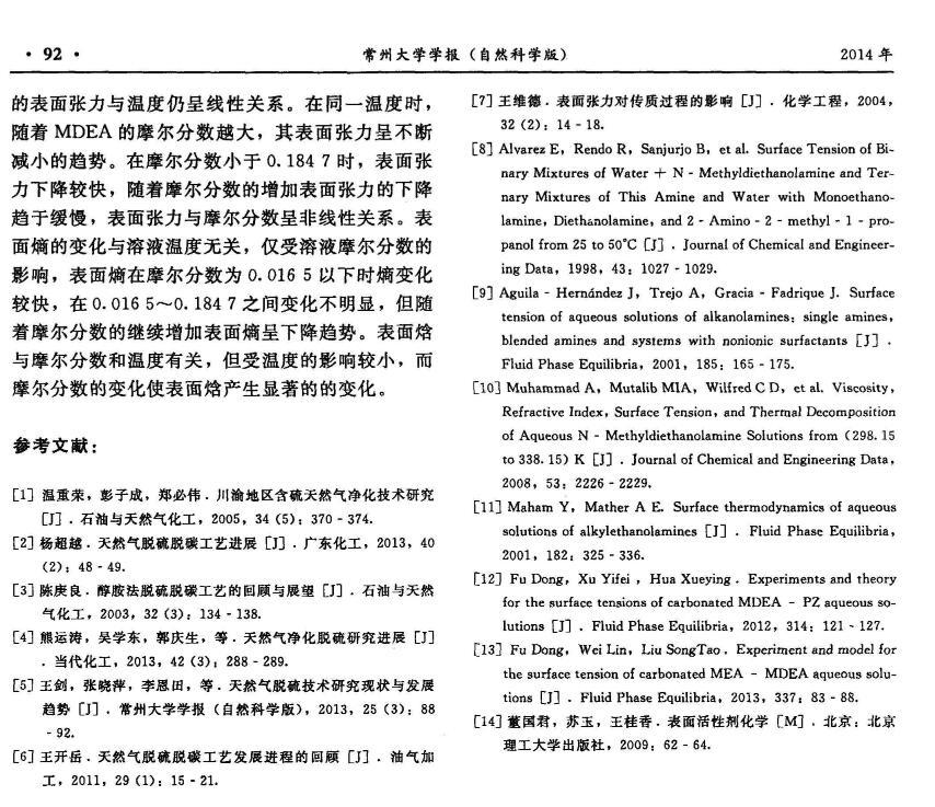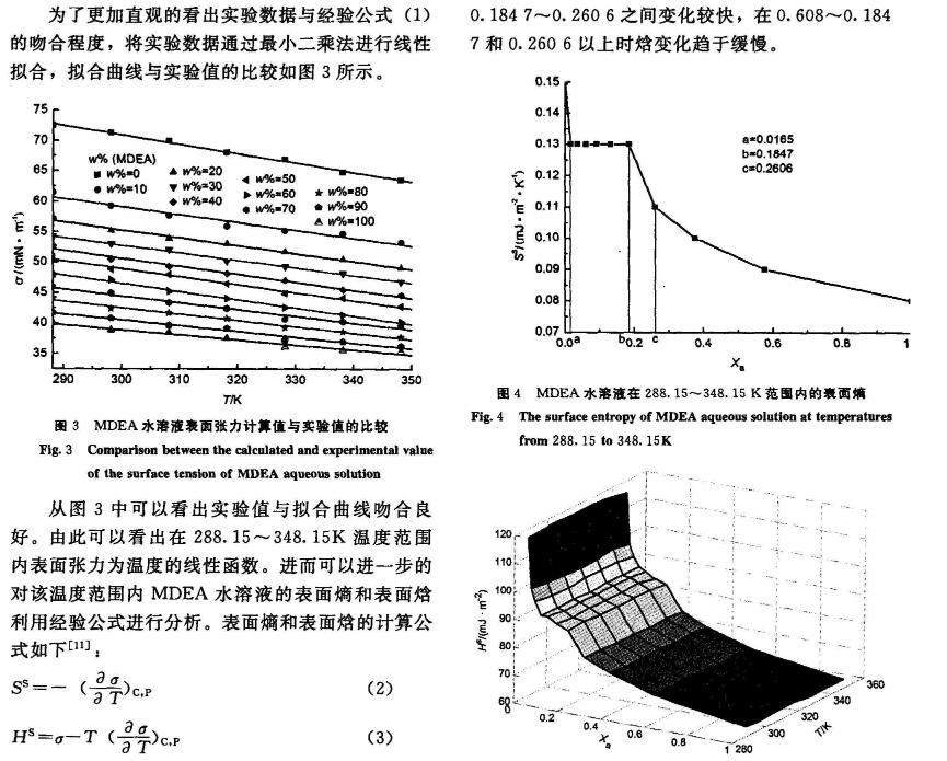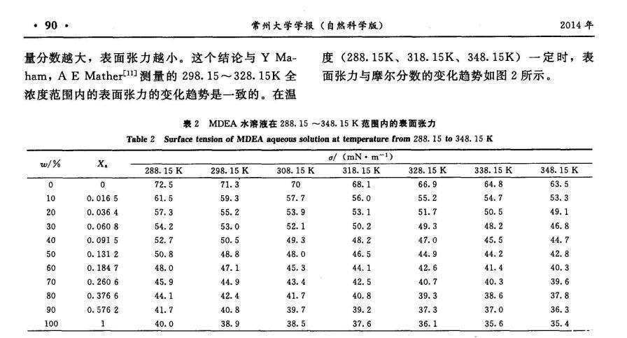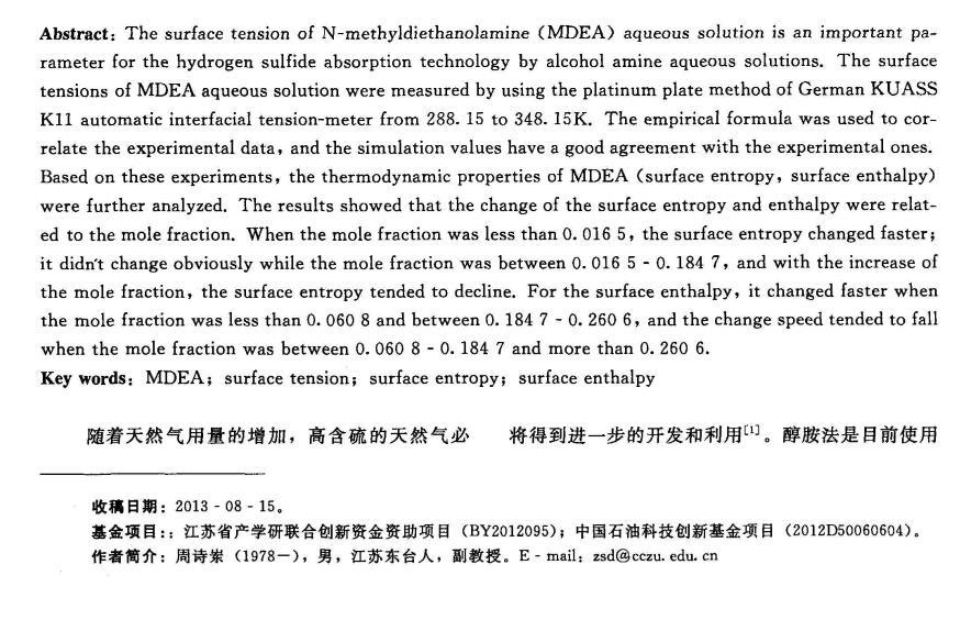 【摘要】:N-甲基二乙醇胺(MDEA)水溶液的表面張力是硫化氫醇胺吸收工藝的一個重要參數。用德國KUASS K11全自動界面張力儀的鉑金板法測定了288.15~348.15K全濃度范圍內的MDEA水溶液的表面張力,并用經驗公式對實驗數據進行了擬合,擬合曲線與實驗值吻合良好。在此基礎上對MDEA的熱力學性質(表面熵,表面焓)進行了進一步分析,結果表明,表面熵在摩爾分數為0.016 5以下時熵變化較快,在0.016 5~0.184 7之間變化不明顯,但隨著摩爾分數的繼續增加表面熵呈下降趨勢。表面焓在摩爾分數為0.060 8以下和0.184 7~0.260 6之間變化較快,在0.060 8~0.184 7和0.260 6以上時焓變化趨于緩慢。