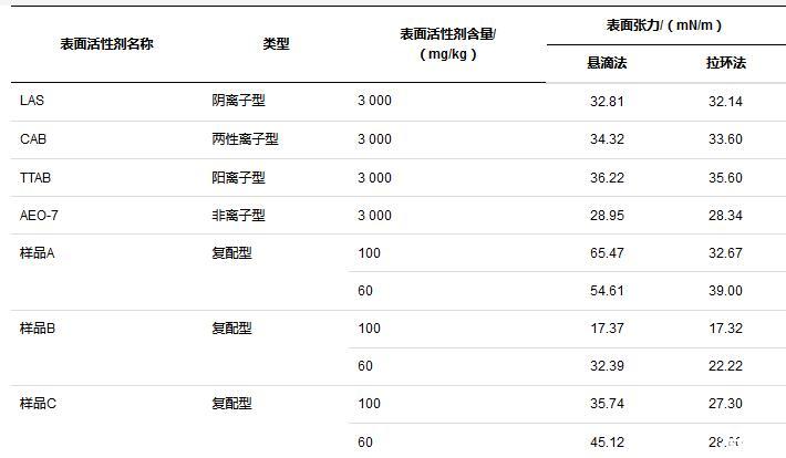 對于溶液而言,表面活性劑的存在能顯著降低表面張力,本文研究了不同表面活性劑溶液,同一含量下,兩種方法測試結果的差異以及同一表面活性劑溶液,不同含量下兩種方法測試結果的差異。所有方法按規范操作執行,測試溫度25℃,平行測定5次取算數平均值,比較結果如表2所示。