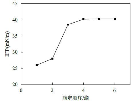 結果表明,液滴懸置5 min后,第一滴液滴表面張力值最小,隨著連續滴定的進行,液滴表面張力值逐漸增大,最終趨于平衡。究其原因,可能是由于懸置一段時間后,表面活性劑分子在表面充分吸附,所以第一滴液滴表面張力最小,而隨著連續滴定進行,由于平衡時間較短,表面活性劑分子在液滴的表面吸附未達平衡,所以數值逐漸增大,然而滴加液滴的速度一定,表面活性劑分子在表面的遷移速率一定,降低表面的能力與效率一定,最終會達到一個穩定值。而平衡時間的長短,與表面活性劑分子的性質有關,遷移吸附速率快的表面活性劑分子所需時間較短。由此可見,使用懸滴法測定表面張力時,時間效應的影響不可忽略。