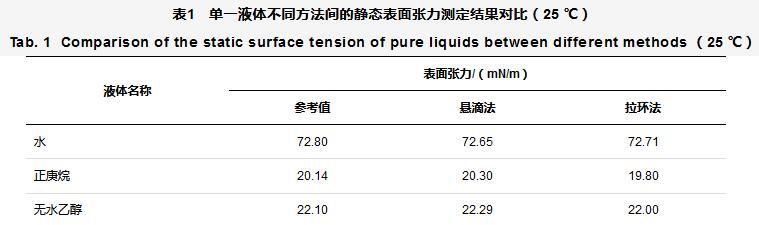 表1單一液體不同方法間的靜態表面張力測定結果對比(25℃)