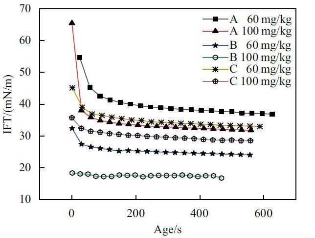 為了充分證明時間效應對懸滴法測定結果會造成影響,實驗使用懸滴法對A,B,C三種表面活性劑復配溶液較稀含量下的動態表面張力進行了研究。結果如圖3所示。