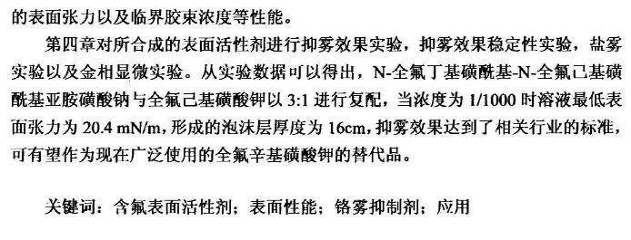 第四章對(duì)所合成的表面活性劑進(jìn)行抑霧效果實(shí)驗(yàn),抑霧效果穩(wěn)定性實(shí)驗(yàn),鹽霧實(shí)驗(yàn)以及金相顯微實(shí)驗(yàn)。從實(shí)驗(yàn)數(shù)據(jù)可以得出,N-全氟丁基磺酰基-N-全氟己基磺酰基亞胺磺酸鈉與全氟己基磺酸鉀以3:1進(jìn)行復(fù)配,當(dāng)濃度為1/1000時(shí)溶液最低表面張力為20.4mN/m,形成的泡沫層厚度為16cm,抑霧效果達(dá)到了相關(guān)行業(yè)的標(biāo)準(zhǔn),可有望作為現(xiàn)在廣泛使用的全氟辛基磺酸鉀的替代品。
