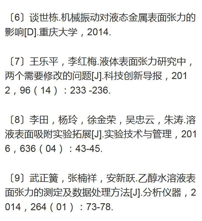 【摘要】:對于最大泡壓法測定表面張力的實驗,我們通過調整冒泡速度對其進行實驗探索。實驗測試了冒泡速度分別為3,5,7,9,11s/個時,乙醇與異丙醇兩種溶液在濃度為10%,20%,30%,40%,50%時表面張力的大小。結果顯示,不同濃度的乙醇與異丙醇溶液,當冒泡速度為11s/個時,這兩種溶液的表面張力值最接近理論值。因此在測定表面張力的實驗時冒泡速度控制在10s/個以上,所得數據更精確。通過初步探索為表面張力實驗的教學改進提供了依據。