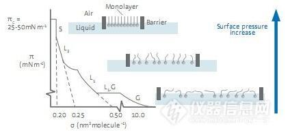 圖1單分子層膜狀態(tài)受表面壓力增加的影響