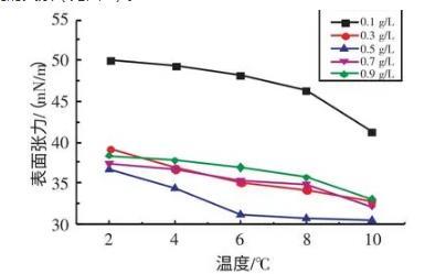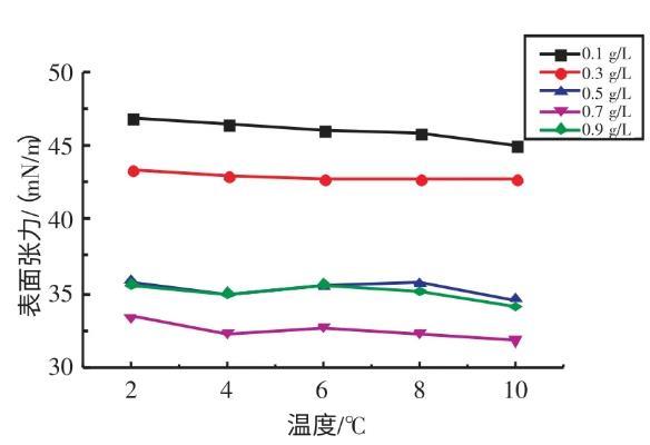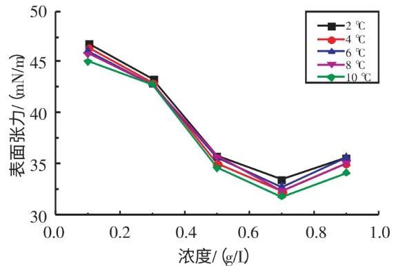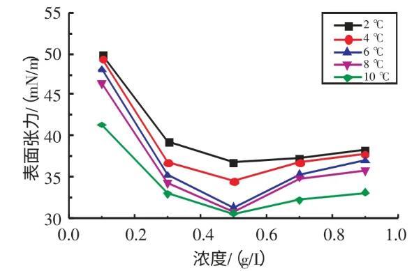 2.2.1不同溫度下十二烷基苯磺酸鈉溶液表面張力與濃度的關(guān)系實(shí)驗(yàn)研究了在溫度為2、4、6、8、10℃條件下,SDBS溶液的表面張力與濃度的關(guān)系(見圖3)。由圖3可知,當(dāng)濃度在0.1~0.7 g/L時(shí),隨著SDBS溶液濃度的升高,其表面張力逐漸減小;當(dāng)濃度在0.7~0.9 g/L時(shí),隨著SDBS溶液濃度的升高,其表面張力逐漸增大。當(dāng)SDBS溶液濃度為0.7 g/L時(shí),其表面張力取得最小值。