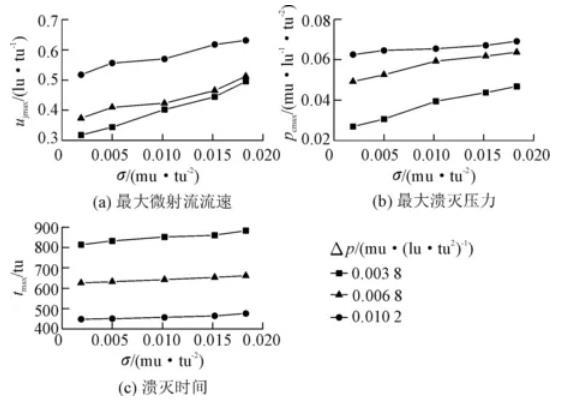 不同表面張力和初始空化泡內外壓差條件下空化泡最大微射流流速、壓力和潰滅時間變化規律如圖3所示。隨著初始內外壓差增大,不同表面張力條件下空化泡潰滅產生的最大微射流流速、最大潰滅壓力均隨之增大,但潰滅時間則隨之減小。初始空化泡內外壓差為0.003 8 mu/(lu·tu2)時,當表面張力由0.001 9 mu/tu2增加到0.018 3 mu/tu2,最大微射流流速增加了55%,最大潰滅壓力增加了74%。初始空化泡內外壓差增加到0.010 2 mu/(lu·tu2)時,空化泡潰滅最大微射流流速僅增加了22%,潰滅壓力僅增加了6%,最大微射流流速和最大潰滅壓力增加幅度均隨著空化泡初始內外壓差的增加而減小,說明空化泡初始內外壓差的增加會減小表面張力對潰滅過程的影響。