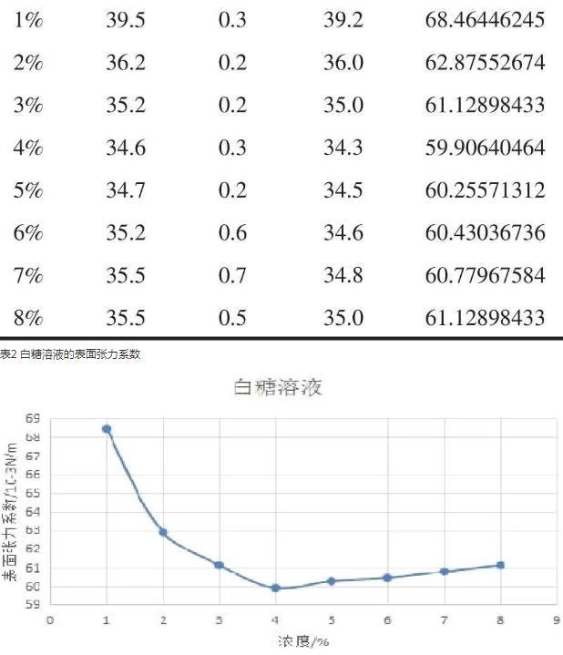 表2白糖溶液的表面張力系數