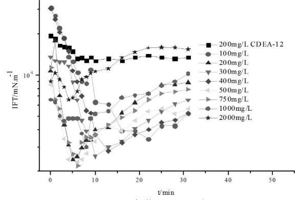 圖2濃度為200mg/LCDEA-12分別與不同濃度NNR復(fù)配油水動態(tài)界面張力關(guān)系