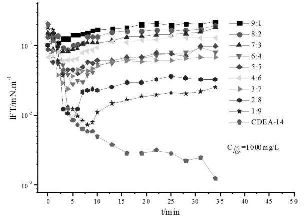 圖1總濃度為1000mg/L CDEA-12和CDEA-14不同復(fù)配比例油水動態(tài)界面張力關(guān)系