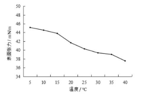由圖1可以看出合成血液表面張力隨著溫度的升高而減少,從原來的45.149mN/m降至37.540mN/m。因為隨著溫度升高,分子鍵引力減弱,表面張力隨溫度升高而減少。同時,溫度升高,液體的飽和蒸氣壓增大,氣相中的分子密度增加,氣相分子對液體表面分子的引力增大,導致液體表面張力減少。