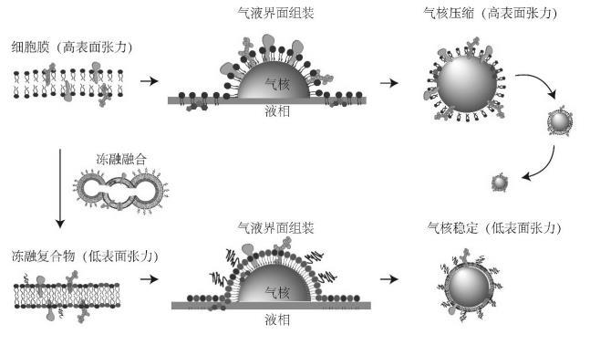 細胞膜是由蛋白質與膽固醇等分子鑲嵌在磷脂中的典型雙分子層結構。細胞膜仿生技術已經成功實現(xiàn)在納米顆粒以及納米液滴表面修飾組裝,并實現(xiàn)體內的長循環(huán)以及良好生物相容性。典型的細胞膜仿生技術是將剝離后的細胞膜直接以磷脂雙分子層的形式包被于納米顆粒或液滴表面。然而由于表面張力作用,細胞膜的磷脂雙分子層無法直接包被在微米級的氣泡表面。