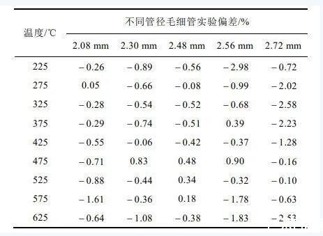 不同管徑毛細(xì)管在不同溫度下實(shí)驗(yàn)結(jié)果偏差如上表2所示。可知,2.72 mm內(nèi)徑毛細(xì)管與基準(zhǔn)值偏差最大,且在不同溫度的實(shí)驗(yàn)偏差波動(dòng)也是最大,從表中結(jié)果可以得出,隨著毛細(xì)管內(nèi)徑增大,實(shí)驗(yàn)結(jié)果偏差和偏差波動(dòng)隨之增大。而2.08mm、2.30mm、2.48mm三個(gè)管徑的偏差相差不大,且從低溫到高溫偏差范圍波動(dòng)較小。因此,在均勻鼓泡下,實(shí)驗(yàn)使用的毛細(xì)管管徑應(yīng)控制在2.0~2.5mm。