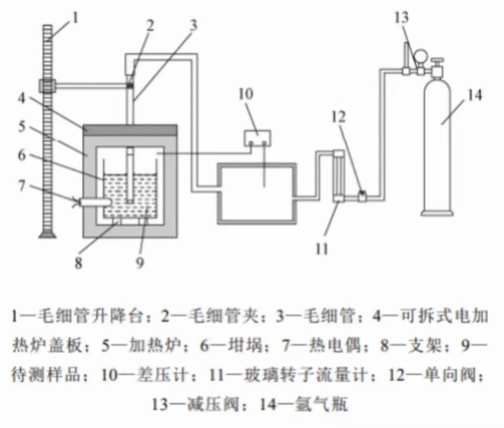 下圖為本文設(shè)計(jì)的測(cè)量裝置原理示意圖與實(shí)物圖,該裝置主要由4個(gè)系統(tǒng)組成:氣路系統(tǒng)、毛細(xì)管升降系統(tǒng)、加熱恒溫系統(tǒng)以及數(shù)據(jù)采集系統(tǒng)。