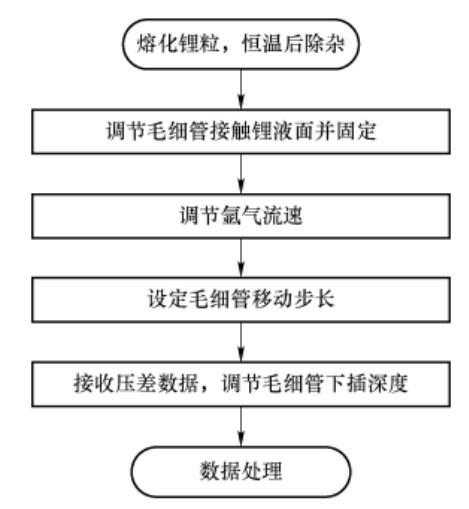 被測(cè)材料為鋰粒,純度為99.974%,總金屬雜質(zhì)為260×10-6。鼓泡所用氣體為高純氬氣,純度≥99.999%,符合GB/T 4842—2017標(biāo)準(zhǔn)。為避免高溫環(huán)境下雜質(zhì)對(duì)實(shí)驗(yàn)結(jié)果的影響,將實(shí)驗(yàn)臺(tái)架放置在充氬氣環(huán)境的手套箱內(nèi),箱內(nèi)壓力為+200~400Pa,氧含量小于0.5×10-6,水含量小于0.2×10-6。實(shí)驗(yàn)基本流程如圖3所示。