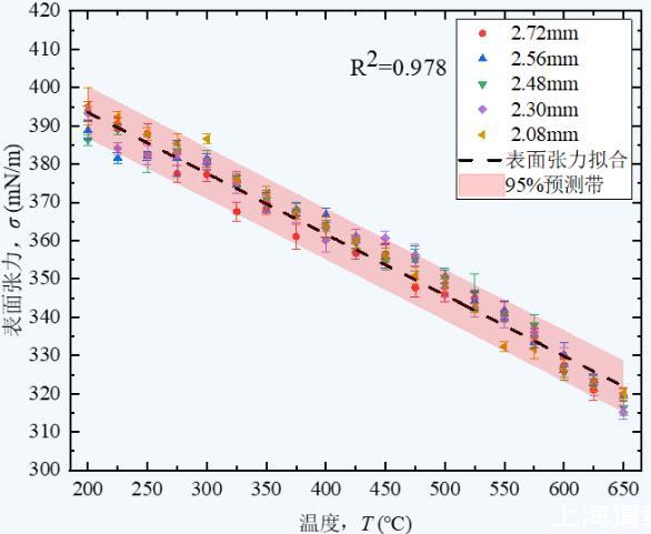 上圖6給出了溫度T在200~650℃范圍內(nèi),使用不同管徑毛細(xì)管測(cè)量的液態(tài)鋰表面實(shí)驗(yàn)值及其擬合曲線。可知,擬合結(jié)果具有良好線性度。各個(gè)溫度點(diǎn)的密度實(shí)驗(yàn)結(jié)果偏差小于±5 mN/m,相對(duì)誤差為±1.4%,且實(shí)驗(yàn)結(jié)果均在線性擬合95%預(yù)測(cè)帶中,說明實(shí)驗(yàn)結(jié)果具有較好可信度。