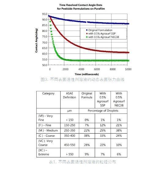 在實際生產(chǎn)中,噴頭尺寸、噴霧壓力也是改變噴量、霧滴粒徑的重要手段之一。本文僅討論了動態(tài)表面張力的改變對噴霧粒徑的影響,期望能為配方設計工作者提供合適的思路。