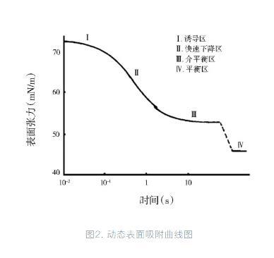許多體系的動態(tài)表面張力和時間對數(shù)的曲線可分為4個階段:誘導區(qū)、表面張力快速下降區(qū)、介平衡區(qū)和平衡區(qū)。在誘導區(qū),由于吸附在界面層上的助劑質(zhì)量濃度太低,溶液的表面張力較大;隨著助劑大量被吸附到溶液表面,表面張力急劇降低,就形成了快速下降區(qū);而隨著溶液表面助劑分子的積累,吸附接近飽和時吸附速度變慢,就形成了介平衡區(qū);足夠長的時間后當表面吸附達到飽和體系進入動態(tài)平衡階段表面張力達到平衡,此即為平衡表面張力。表面活性劑種類和質(zhì)量濃度不同,其溶液體系達到上述各階段所需時間不同,表現(xiàn)為各溶液體系間動態(tài)表面活性的差異。